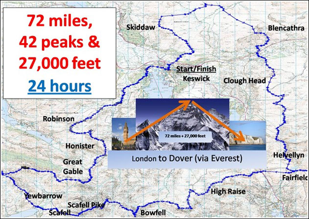 There are 42 summits over 66-72 miles with 27000ft of ascent and it has to be done in under 24 hours. I did mine in 2009 (Club member No.1508) with my mate Glen. It is a tough day/night out.