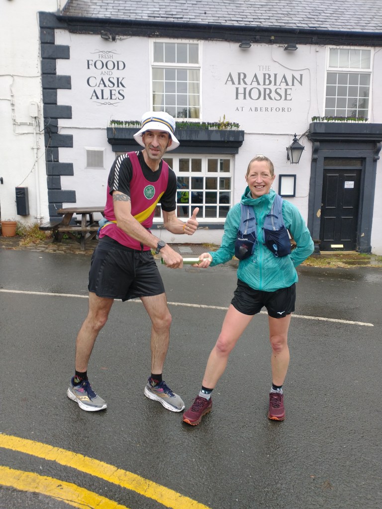 Radio York were there to capture the occasion and to a roar of applause, Graeme from York ran in with the baton and to the biggest cheer I have ever heard, I was off, into the torrential rain, soaked to the skin by the time I left the school grounds and down a country lane, where a rocket powered DPD van almost cut my relay short and simultaneously obscured the ever-so-slight, but very important road junction I should have taken. Splashing blindly onwards, I did sense I was off route but the magical power of the Pudsey and Bramley vest and its calming “Don’t fret, it’ll come good” mantra took me 3 miles off course, meaning that the generous time schedule (which was running exactly to time after 10 days) became a race to get to Taddy in time, to pick up another runner.
